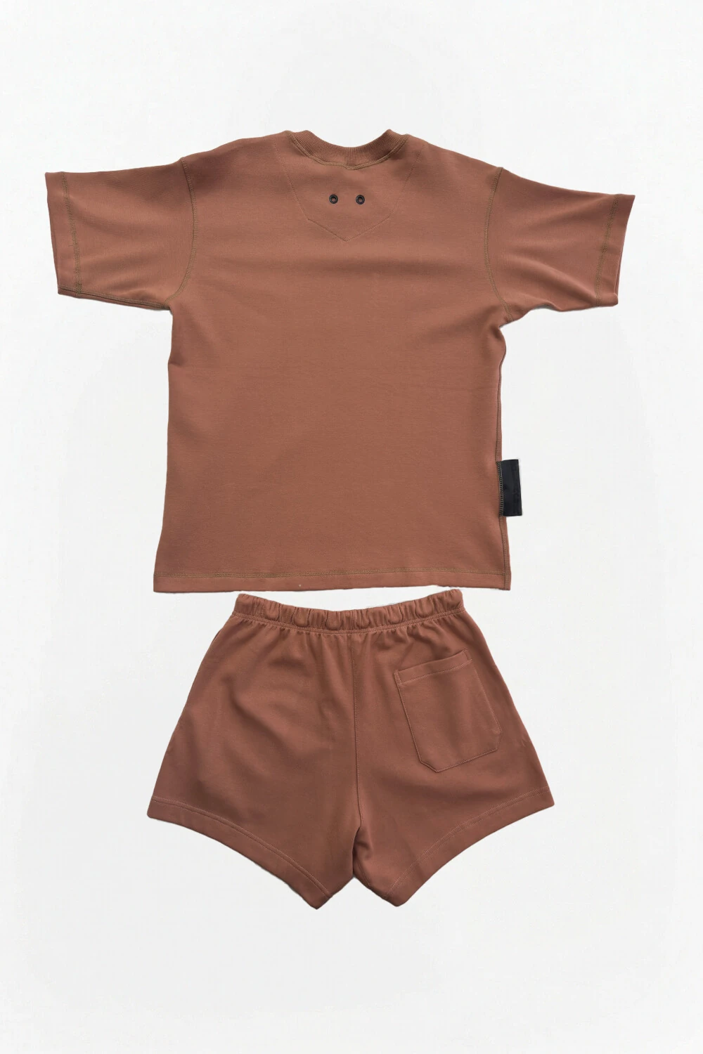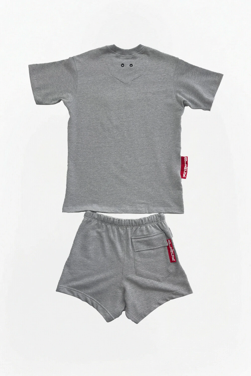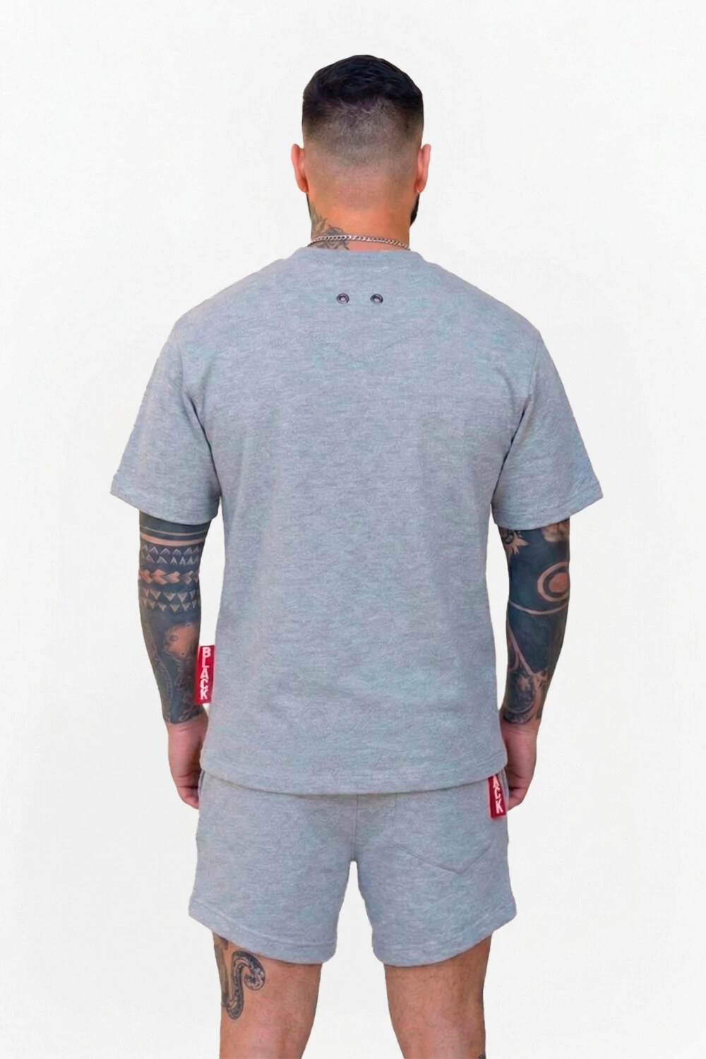Detalhes: Presença de um patch retangular preto na perna direita, harmonizando com os detalhes da camiseta.